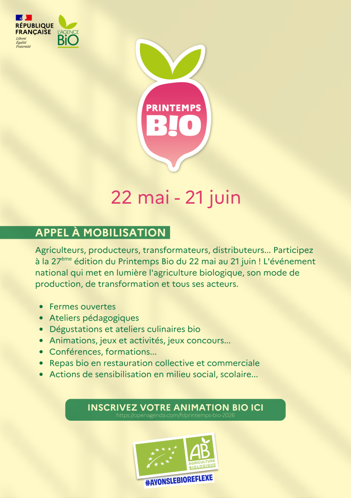 Agriculteurs, producteurs, transformateurs, distributeurs… Participez à la 26ème édition du Printemps Bio ! L’événement national qui met en lumière l’agriculture biologique, son mode de production, de transformation et tous ses acteurs. Au programme :