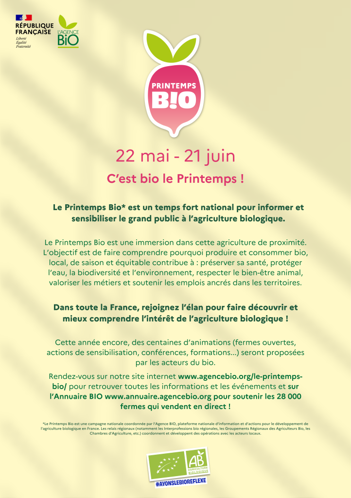 Comme tous les ans, le Printemps Bio, c’est du 22 mai au 21 juin avec des événements autour de l’agriculture et de l’alimentation bio organisés dans toute la France. Découvrez ou redécouvrez la bio avec les agriculteurs, les producteurs, les transformateurs et les distributeurs près de chez vous qui ouvrent leurs portes pour le Printemps Bio !